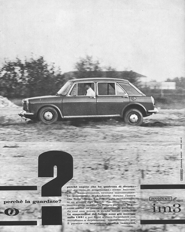 The initials “IM3” merged the initials of the two brands Innocenti and Morris, whilst the “3” referred to the third model produced in collaboration with the British group, after the A40 and the Spider. The car entered production in 1963 and differed from the British version at the front, styled by Pininfarina and with vertical lights and better-quality internal finishes. Qualities shared with the British version were the remarkable abilities of the car, the innovative Hydrolastic suspension and the 55 bhp 1100 cc engine combined with front-wheel drive, which positioned the car almost in the luxury sector, also highlighted by the rather high price.