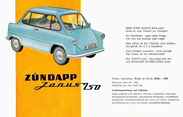This original and non-conformist solution led Zündapp to choose the name Janus, from Giano, the Roman god depicted as two-faced with one face looking forwards and the other looking behind.