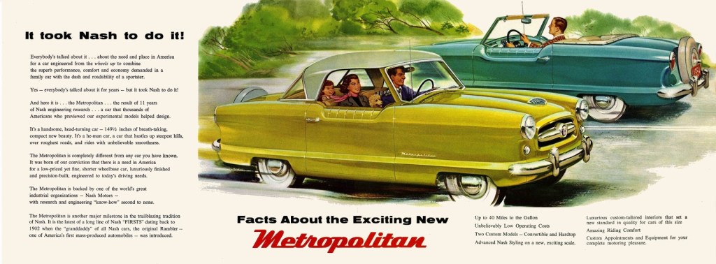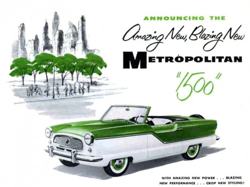 It was a project which was counter to the other production of Nash and was developed in conjunction with English Austin, which took care of the mechanical base and final assembly at their Longbridge plant from October 1953 to April 1961. The body was not produced at the factory but by Fisher & Ludlow. The Metropolitan was derived from the Nash NXI prototype, from which it took a large part of the shape and some solutions for the interchangeability of components, such as the symmetrical door skins. The NXI also had symmetrical front and rear components, but the final production model abandoned this solution. From the mechanical point of view, the small utilitarian car was equipped with a 1200 cc engine from the Austin A40 and a three-speed gearbox. After about a year the Series II was launched, maintaining the 1200 cc power unit but it was more modern and had a new gearbox. In 1955 came the third series, powered by a new 1498 cc engine from the Austin A50; its design was also updated with a new front grille. From the third series, commencing in 1957, the Nash and Hudson marques, under which the car was marketed, disappeared and the Metropolitan became a model and marque in its own right. The fourth and final series appeared in 1959, featuring updates to the more powerful engine and changes to the design, new body colours and interior upholstery. Production ceased in 1961, but sales continued until 1962.
