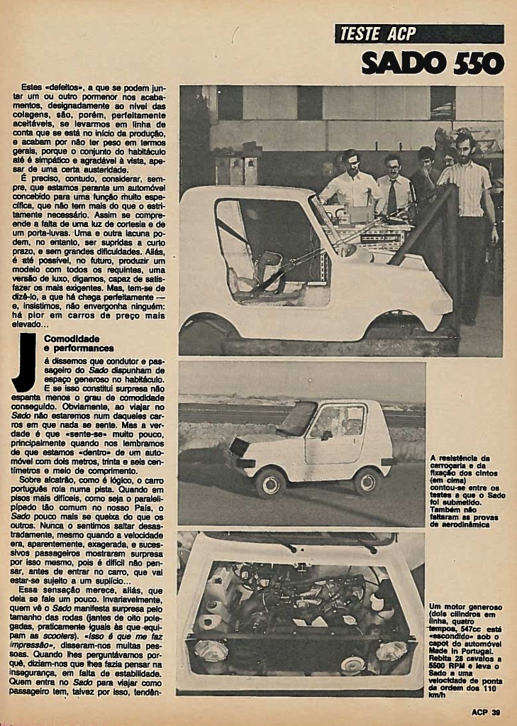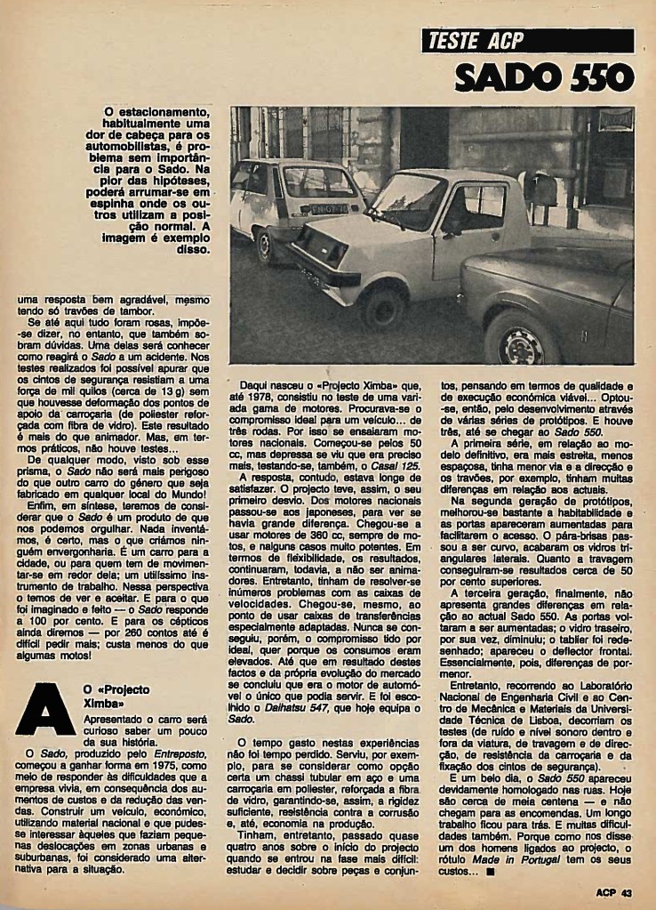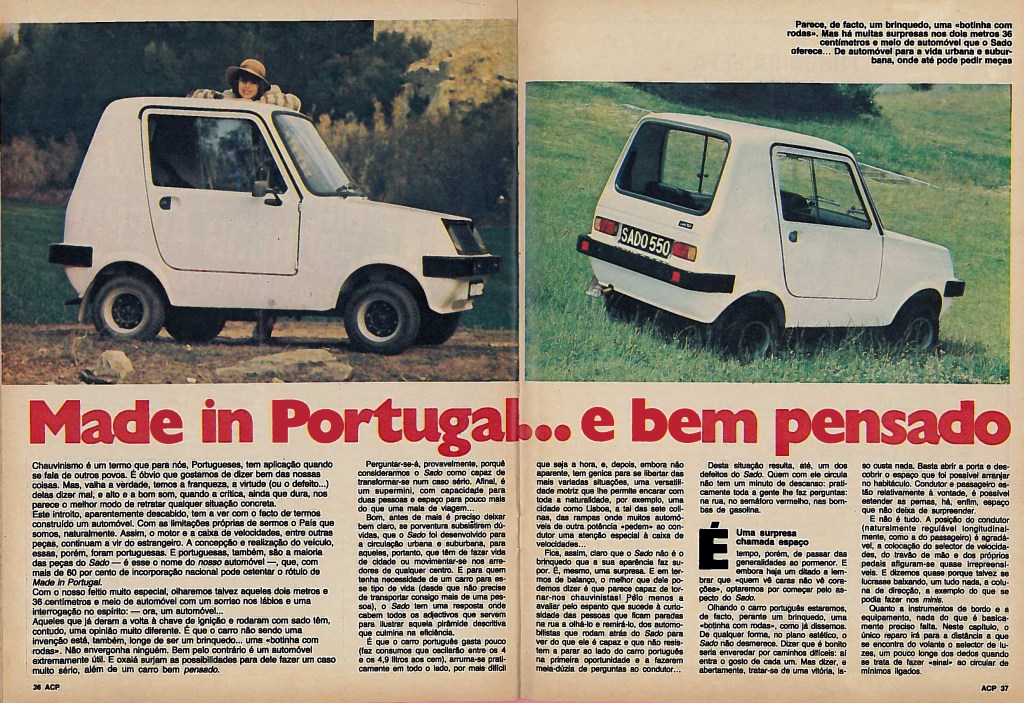 Seen from this perspective, however, the Sado is no more dangerous than any other similar car produced anywhere else in the world! In any case, in short, we must consider that the Sado is a product we can be proud of. We have not invented anything, that’s for sure, but what we have created will not embarrass anyone. It is a car for the city or for those who need to drive on urban roads: a very useful work tool. From this perspective we have to see it and accept it. And for what has been imagined and done – the Sado responds one hundred percent. And for sceptics we will continue to say – for 260 Contos it would be difficult to ask for more. It costs less than some scooters!