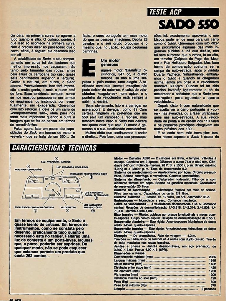 However, the National Laboratory of Civil Engineering and the Mechanics Centre were consulted for the tests and Materials of the Technical University of Lisbon (noise and sound-level inside and outside the car, braking and steering, body strength and safety belt locking). And, one fine day, the Sado 550 appeared, fully approved, on the streets. Today there are about 50 of them – and not being delivered because of orders. A long job has been completed. And also many difficulties. Because, as one of the men linked to the project said: the Made in Portugal label has its costs…
