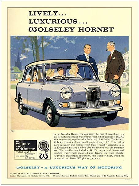 In contrast to the birth of the Cooper versions it should also be mentioned that 1961 also saw the birth of three-volume versions of the Mini, the Riley Elf and Wolseley Hornet, which featured much more luxurious leather trim and wooden dashboards; they were stylistically less successful than the regular Minis but remained in production for nearly a decade.