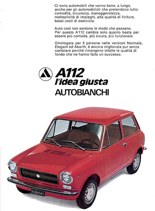 The continuous success of the A112 prompted Autobianchi to introduce constant updates during its 17 years of production, starting in 1973 with the second series, which differed from the previous one with rubber-coated bumpers on the new entry-level Elegant version, which took over from the previous E, in addition to the possibility of ordering the Abarth version in a unique colour.