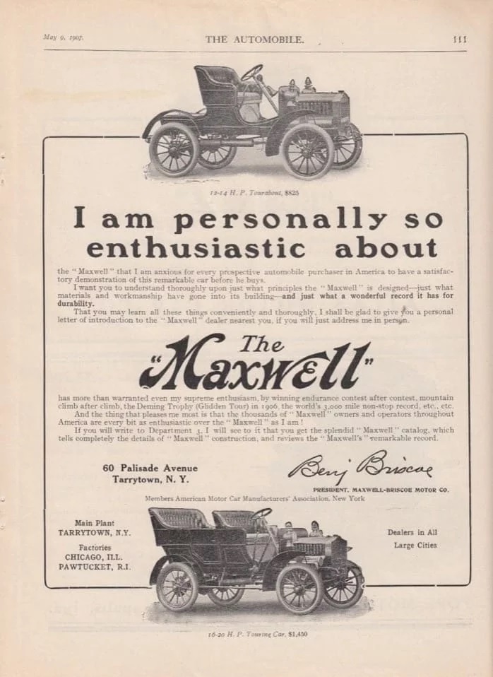 As for Maxwell-Briscoe, it became part of the United States Motor Company group in 1910, which sadly failed three years later. The reorganisation of the company led to the farewell of the founder Briscoe, whilst the new Maxwell Motor Company continued its activities in 1925, when it was absorbed by the still extant and well-known Chrysler.
